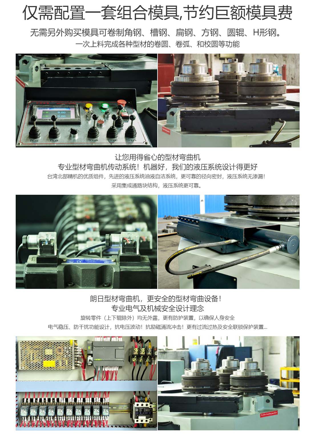 公司主要產(chǎn)品有:大、中、小型,型材彎曲機(jī)、 型材卷圓機(jī)、 法蘭成型機(jī)等型材彎曲設(shè)備。我們的優(yōu)勢:僅需配置一套組合模具,節(jié)約巨額模具費(fèi)無需另外購買模具可卷制角鋼、槽鋼、扁鋼、方鋼、圓輥、H形鋼。一次上料完成各種型材的卷圓、卷弧、和校圓等功能。支持非標(biāo)定制。