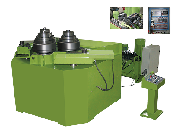 型材彎曲機(jī)的好處是卷制型材的精度好、效率高,型材彎曲機(jī)的兩個(gè)下輥為主傳動(dòng)輥,也可以三個(gè)工作輥為主傳動(dòng)輥,上輥位置固定,兩個(gè)邊輥圍繞固定回轉(zhuǎn)中心作弧線升降運(yùn)動(dòng),液壓控制,位移液晶顯示,顯示精度±0.1mm,有利于控制型材成形過(guò)程;兩側(cè)設(shè)有托輥裝置,有利于保證非對(duì)稱截面型材的卷制質(zhì)量。本機(jī)結(jié)構(gòu)先進(jìn),功能全,是目前國(guó)內(nèi)外先進(jìn)的型材成型設(shè)備,可根據(jù)用戶使用情況立放或臥放。是弧線下調(diào)型材卷彎?rùn)C(jī),該機(jī)可一次上料完成型材的預(yù)彎、卷圓和校圓工序。